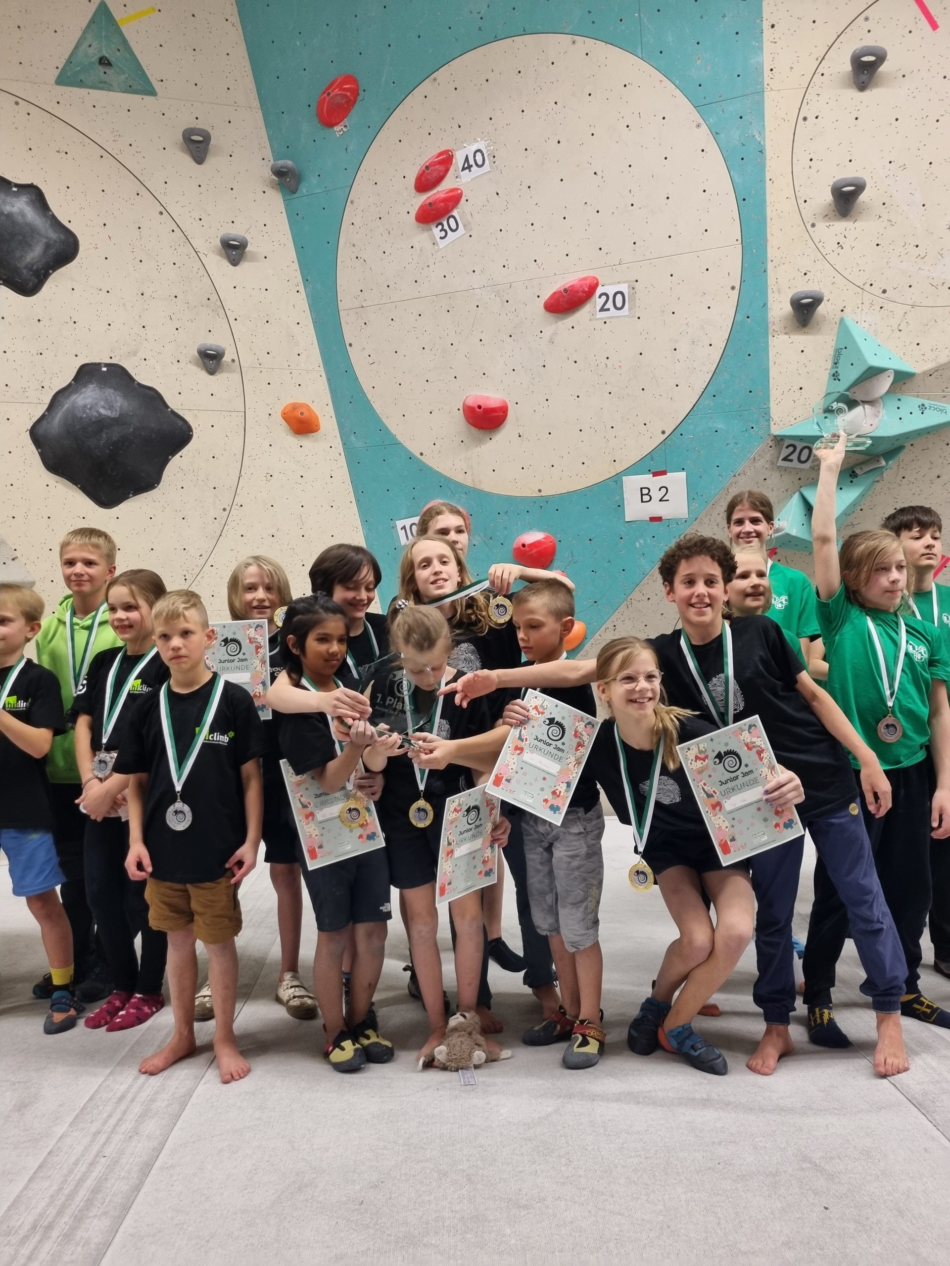 Am vergangenen Wochenende ging es auch für unsere Jüngeren richtig zur Sache. Beim Finale des Junior Jam, einem Team-Boulderwettbewerb für Kids zwischen sieben und zwölf Jahren, haben sich über 160 Kids aus ganz Norddeutschland um den Einzug ins Superfinale gebattelt – und unser Team hat am Ende den ersten Platz geholt und den Pokal nach Hause getragen.